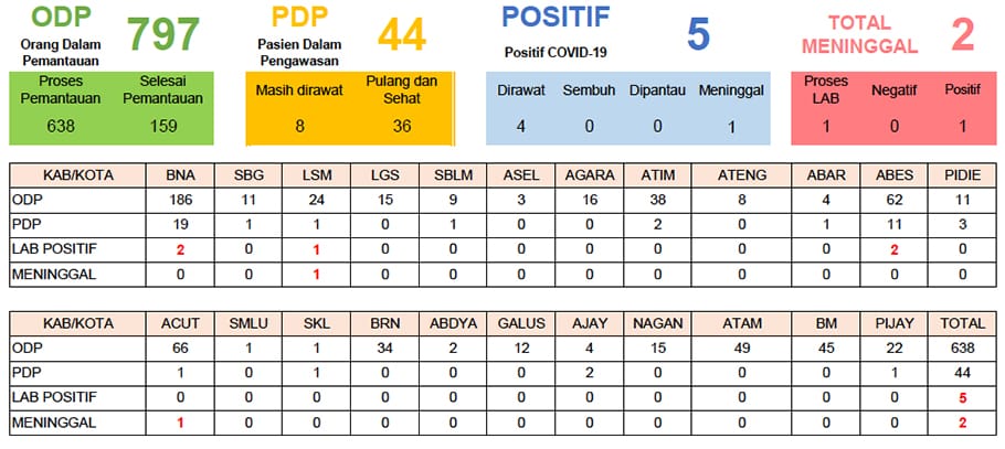 Lebih lanjut SAG menjelaskan, pasien Positif Covid-19 di Aceh tidak ada penambahan, masih tetap 5 orang. Rincianya, 4 pasien Positif Terinfeksi Covid-19 dalam perawatan di ruang RICU RSUDZA Banda Aceh. Sedangkan satu orang lainnya telah meninggal dunia beberapa hari lalu di RSUDZA.