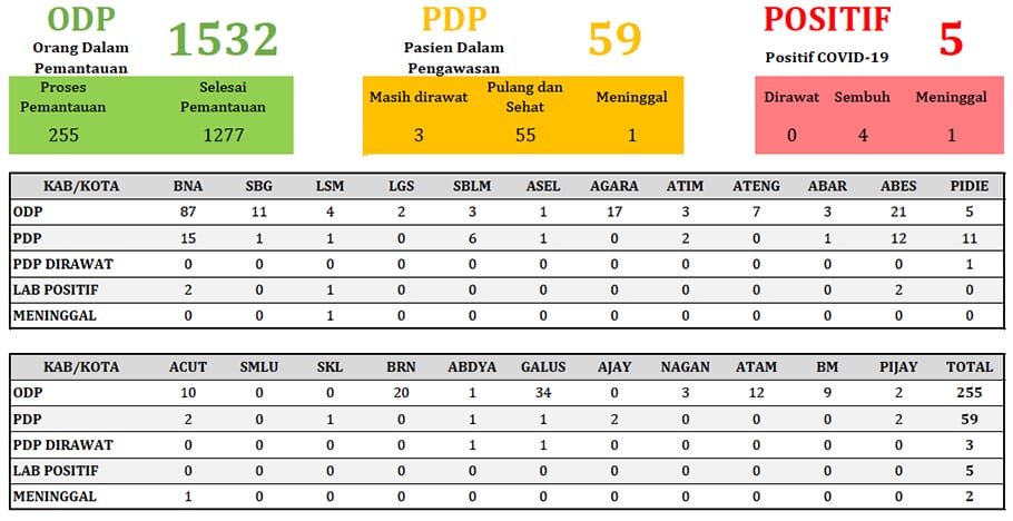 Dari 59 PDP di Aceh, sebanyak 55 orang telah dinyatakan sehat dan sudah diizinkan pulang, dan 1 lainnya telah meninggal dunia.