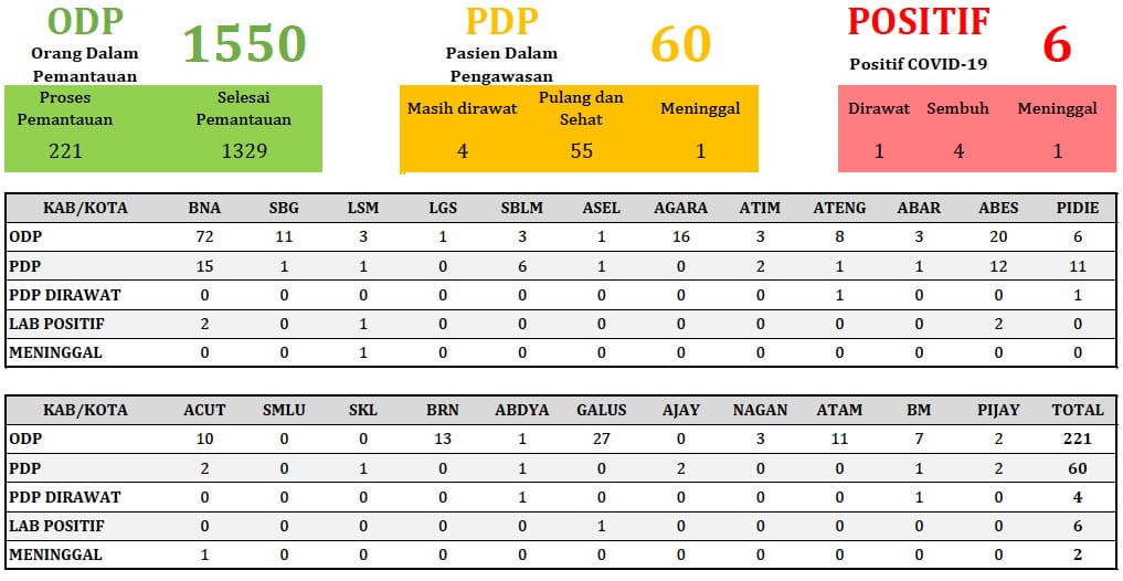 Banda Aceh — Jumlah pasien yang positif terinfeksi Coronavirus Disease (Covid-19) di Provinsi Aceh kini sudah bertambah menjadi enam orang.