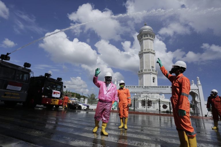 Lokasi pertama yang disasar Jalan Tgk Chik Pante Kulu, depan Masjid Raya Baiturrahman. Di sana, Wali Kota Aminullah yang mengenakan baju Hazmat plus atributnya, ikut menyemprot area masjid kebanggaan masyarakat Aceh itu dengan cairan disinfektan.