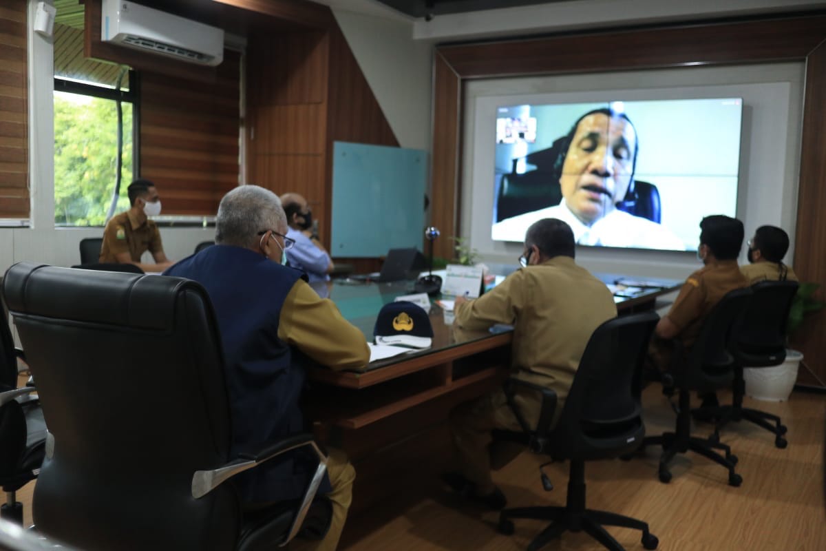 Sekda Aceh, Taqwallah mengikuti acara Monitoring dan Evaluasi Implementasi Program Pencegahan Korupsi Terintegrasi Provinsi Aceh Tahun 2020 secara online, di ruang rapat Sekda, Senin (27/4).