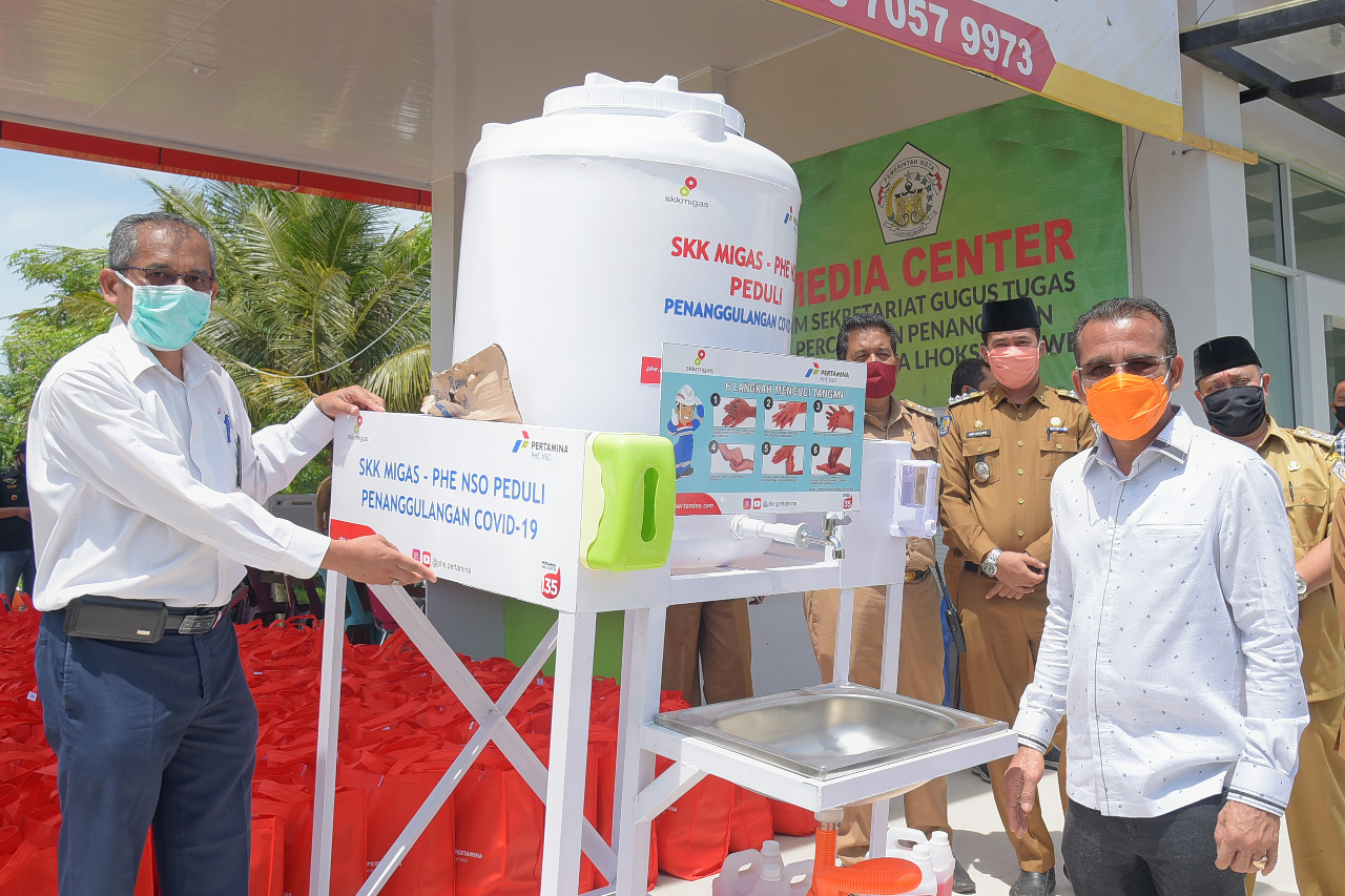 Lhokseumawe – Dalam mendukung upaya pencegahan dan penanganan Covid-19 di Kota Lhokseumawe dan Kabupaten Aceh Utara, PT. Pertamina Hulu Energi (PHE) NSO bersama SKK MIGAS menyerahkan sebanyak 400 paket makanan pokok dan 11 unit wastafel portable peralatan cuci tangan yang akan ditempatkan di mesjid-mesjid pusat kecamatan di sekitar wilayah operasi PHE NSO di Kota Lhokseumawe dan Aceh Utara.