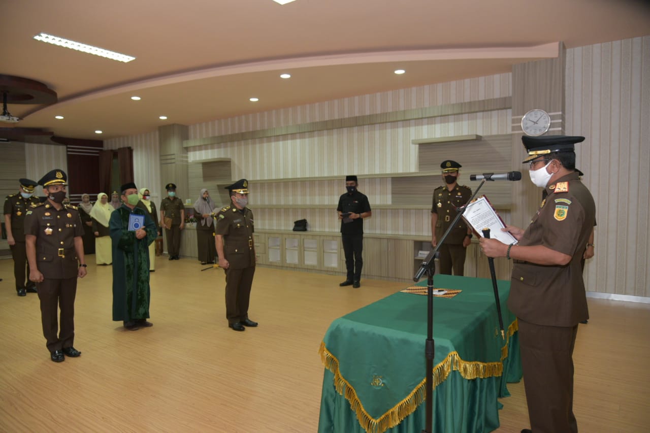 Prosesi pelantikan yang dilaksanakan berjalan sesuai dengan aturan protokol kesehatan pencegahan Covid – 19 di Aula Kejati Aceh, Banda Aceh, Rabu (20/5). Kegiatan itu diikuti semua pejabat Kejati mulai Wakajati, para asisten, dan pegawai kejaksaan setempat.