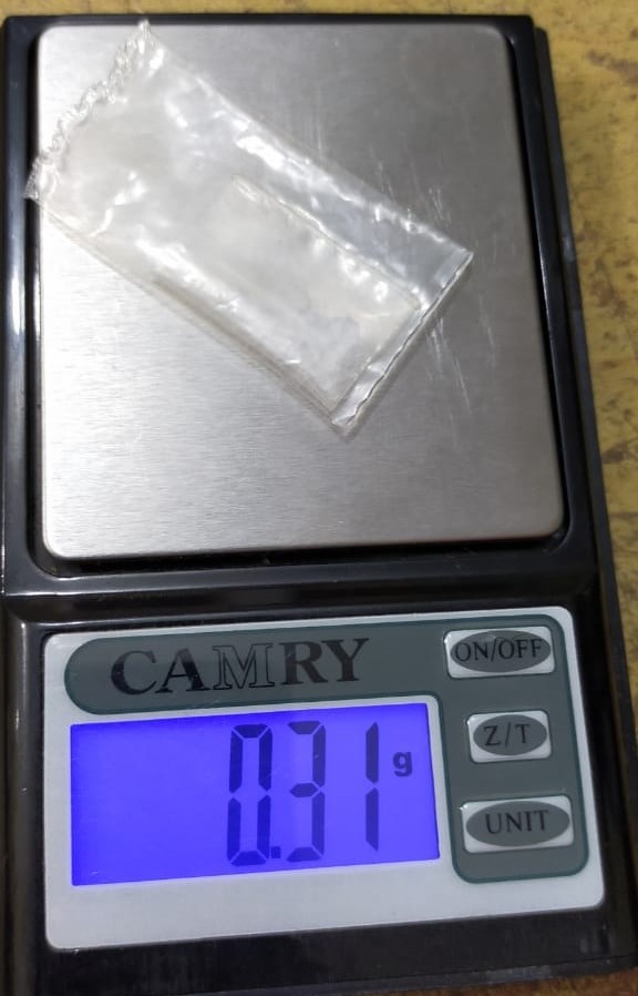Saat tersangka ditangkap, petugas melakukan penggeledahan badan dan sekitar TKP. Petugas menemukan barang bukti berupa satu bungkusan dari plastik warna bening yang di dalamnya berisikan sabu dengan berat 0,31 gram.