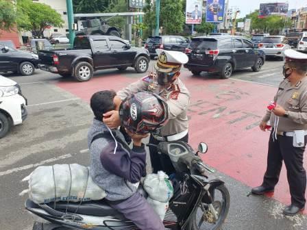 Banda Aceh — Puluhan personil Direktorat Lalu Lintas (Ditlantas) Polda Aceh membagikan 1.000 masker merah putih kepada masyarakat pengguna jalan yang tidak menggunakan masker di kawasan Simpang Lima, Kota Banda Aceh, Senin (10/8).