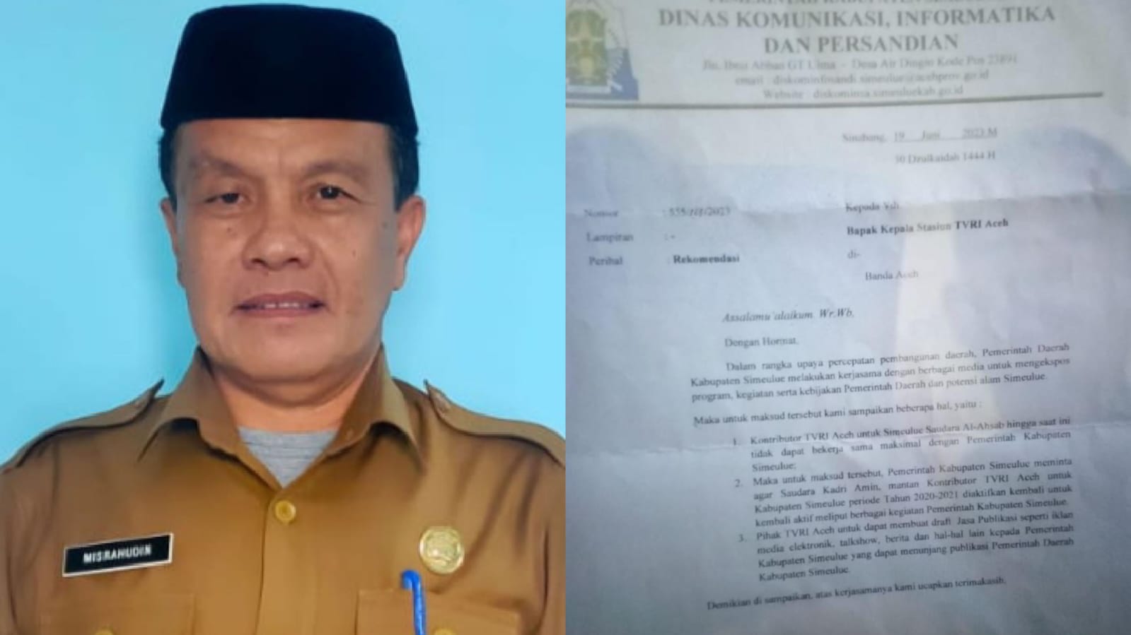 Dilihat pada Ahad (9/7), dalam suratnya, Kepala Diskominsa Simeulue Misrahudin SE merekomendasikan agar diaktifkan kembali kontributor sebelumnya, yaitu Kadri Amin.