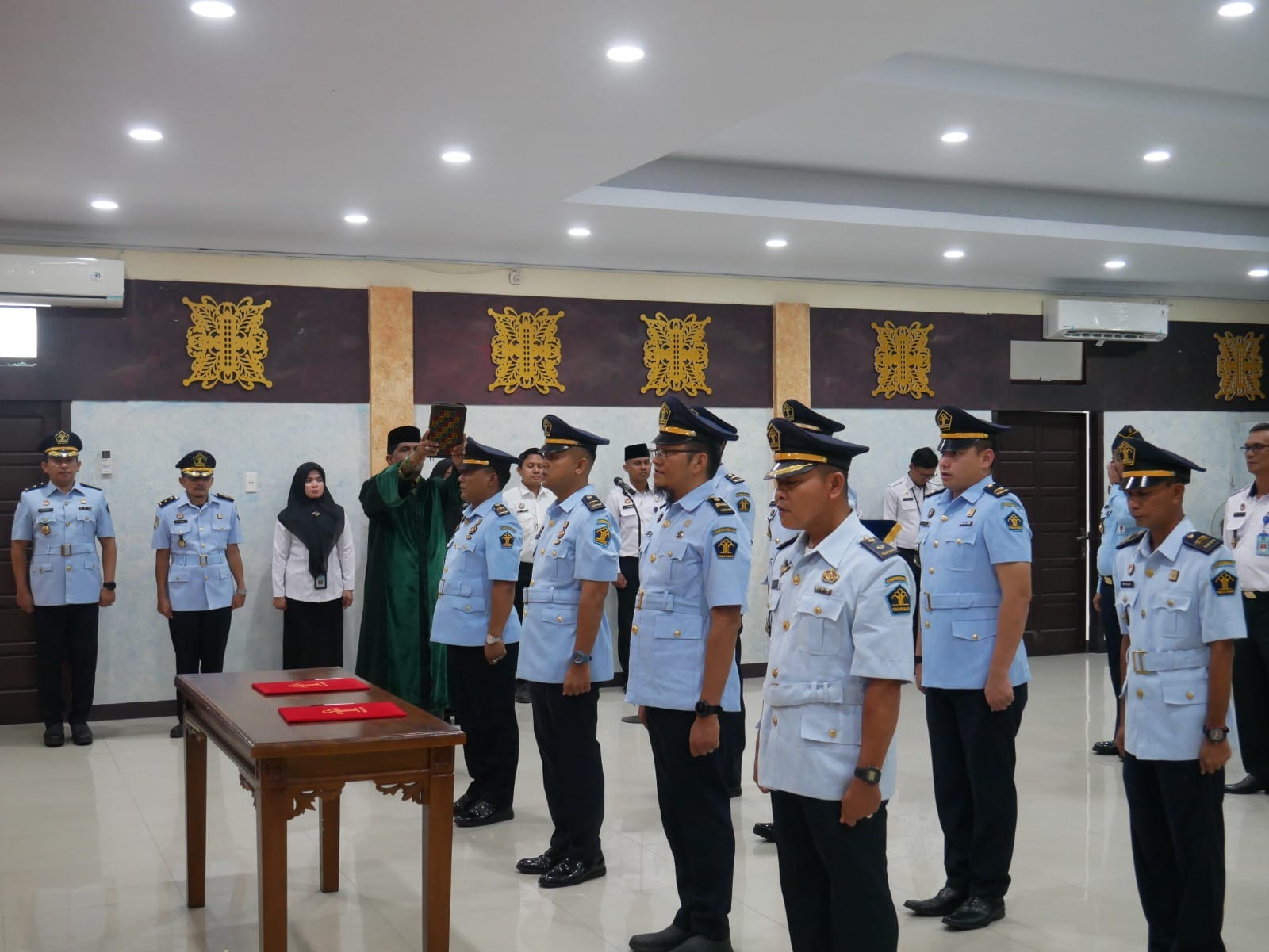 BANDA ACEH – Plh. Kepala Kantor Wilayah Kementerian Hukum dan HAM (Kemenkumham) Aceh Rakhmat Renaldy mengambil sumpah serta melantik 8 pejabat struktural dan fungsional pada Rabu pagi (12/7/2023), di aula Bangsal Garuda Kemenkumham Aceh.