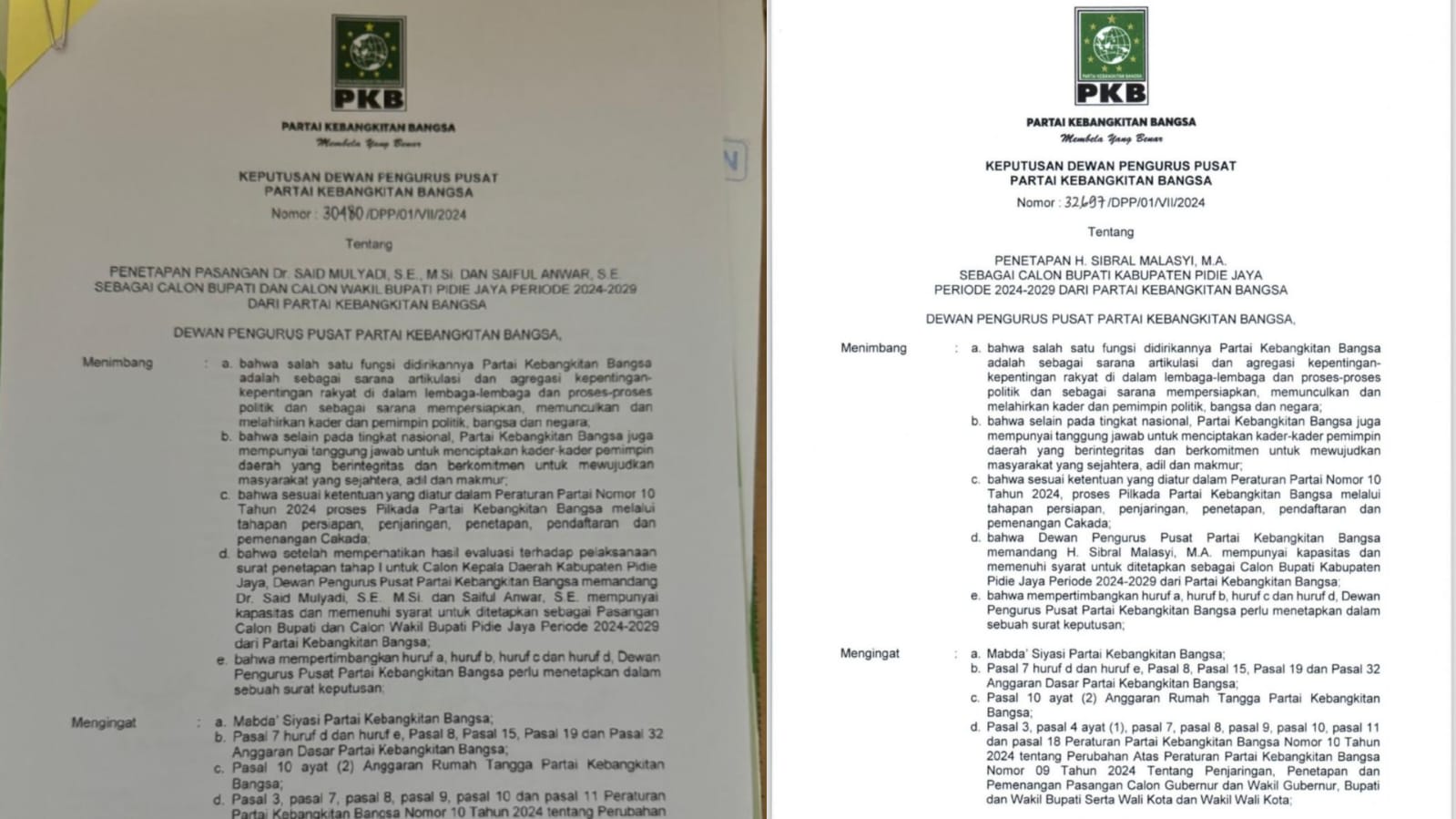 Kemudian keluar surat kedua nomor 30044/01/DPP/2024 pada tanggal 5 Juli 2024 tentang penetapan Said Muliadi dan Saiful Anwar sebagai calon Bupati dan Wakil Bupati Pidie Jaya periode 2024 – 2029 dari PKB yang langsung ditandatangani Ketua Umum Muhaimin Iskandar dan Sekjen M Hasanuddin Wahid.