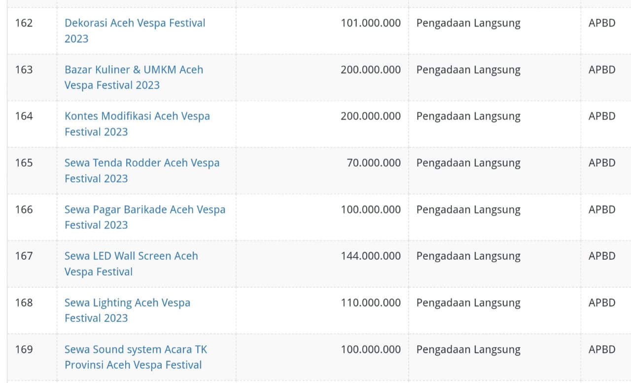 BANDA ACEH — Agenda Dinas Kebudayaan dan Pariwisata (Disbudpar) Aceh yang menyelenggarakan Aceh Vespa Festival pada 28-31 Juli 2023 dengan menghabiskan anggaran mencapai sejumlah Rp 1 miliar masih menyisakan sorotan dan kritikan dari sejumlah pihak.