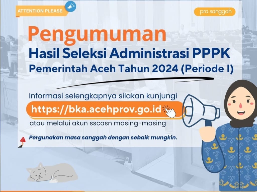 Berdasarkan Peraturan Menteri Pendayagunaan Aparatur Negara dan Reformasi Birokrasi RI Nomor 6 Tahun 2024 tentang Pengadaan Pegawai Aparatur Sipil Negara, diumumkan hasil Seleksi Administrasi Pra Sanggah Pegawai Pemerintah dengan Perjanjian Kerja (PPPK) Tahap Pertama di lingkungan Pemerintah Aceh Tahun 2024.