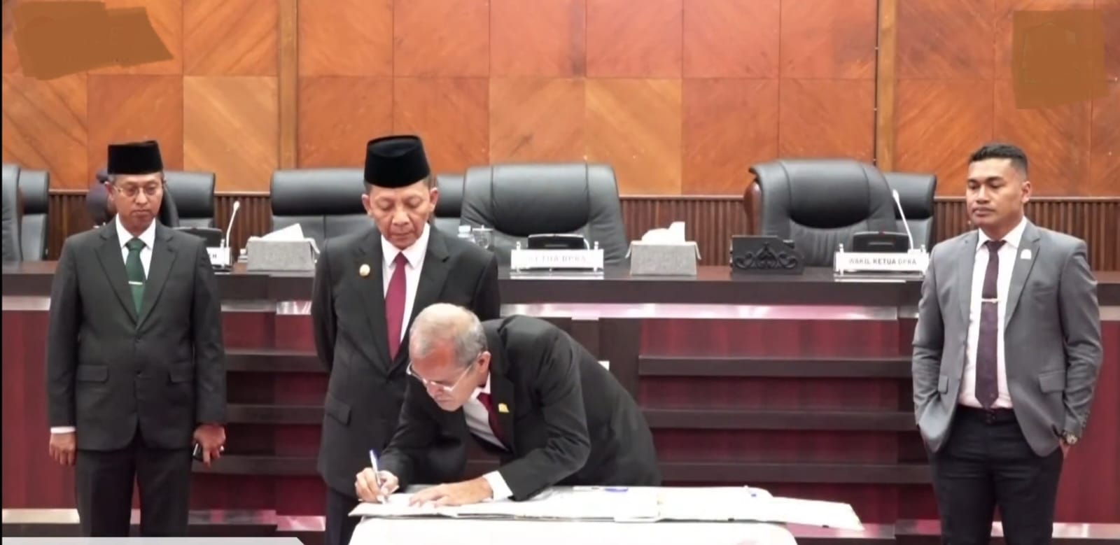 Penandatanganan dilakukan oleh Pj Gubernur Aceh Achmad Marzuki dan Wakil Ketua I DPRA Dalimi, Wakil Ketua III Safaruddin, dalam rapat paripurna DPRA, yang berlangsung Selasa malam (26/9).