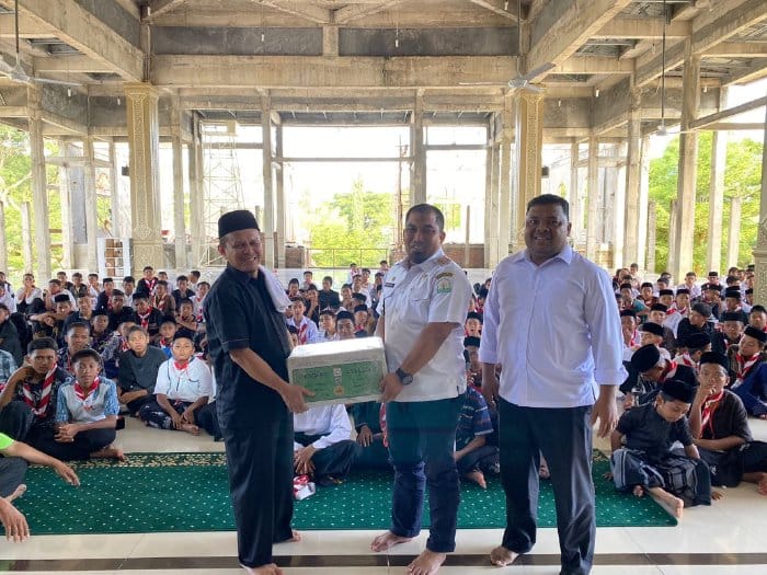 ACEH BESAR – Pj Bupati Aceh Besar Muhammad Iswanto menyerahkan 40 buah Al Quran cetakan Madinah kepada Pimpinan Pesantren Modern Tgk Chik Oemar Diyan Ustaz Fakhruddin Lahmuddin di Gampong Krueng Lamkareung, Kecamatan Indrapuri, Aceh Besar, Rabu sore (13/9/2023).