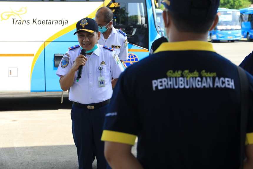 Kadis Perhubungan Aceh, Junaidi, memberikan arahan pada pelepasan tim pemantau pemudik di Terminal Tipe A Batoh, Banda Aceh
