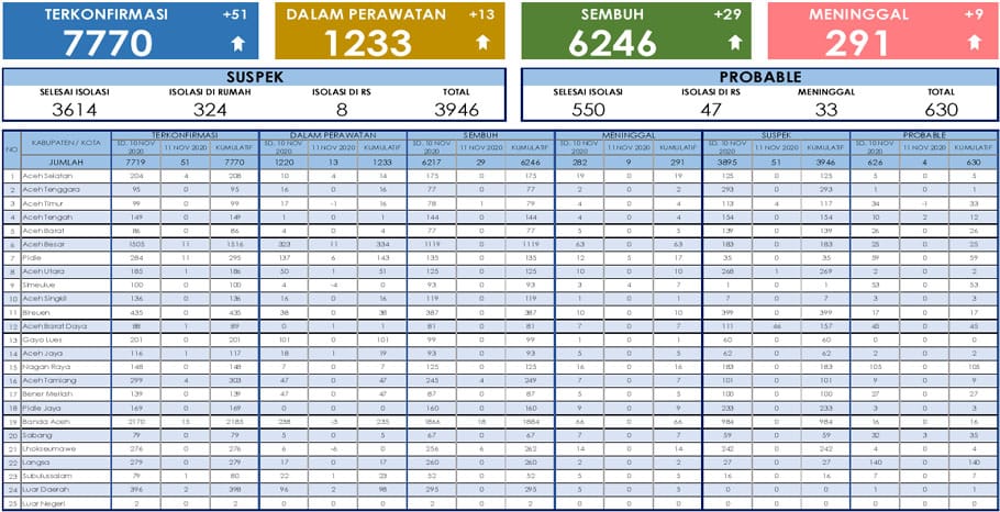 Selanjutnya, kasus Covid-19 Aceh secara akumulatif sejak kasus konfirmasi pertama dilaporkan pada 27 Maret hingga 11 November 2020. Jumlah kasus Covid-19 Aceh sudah mencapai 7.770 orang, sedang dalam perawatan 1.233 orang, sudah sembuh 6.246 orang dan meninggal dunia 291 orang.