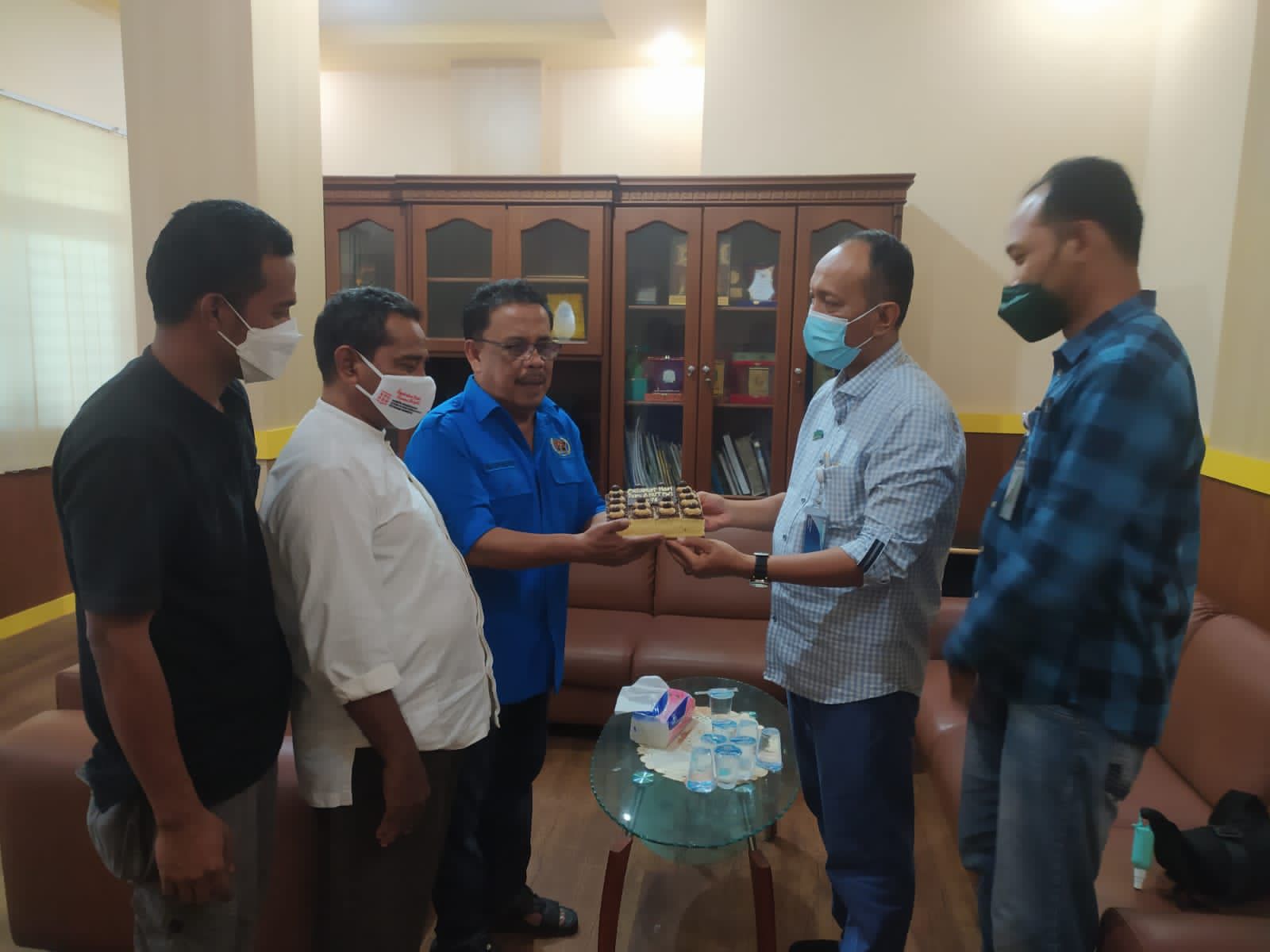 Ketua PWI Aceh Nasir Nurdin menerima kue HUT ke-76 PWI dan HPN 2022 dari Kacab BP Jamsostek Banda Aceh, Awalul Rizal ketika bersilaturahmi ke Kantor PWI Aceh Jum'at sore (11/2)