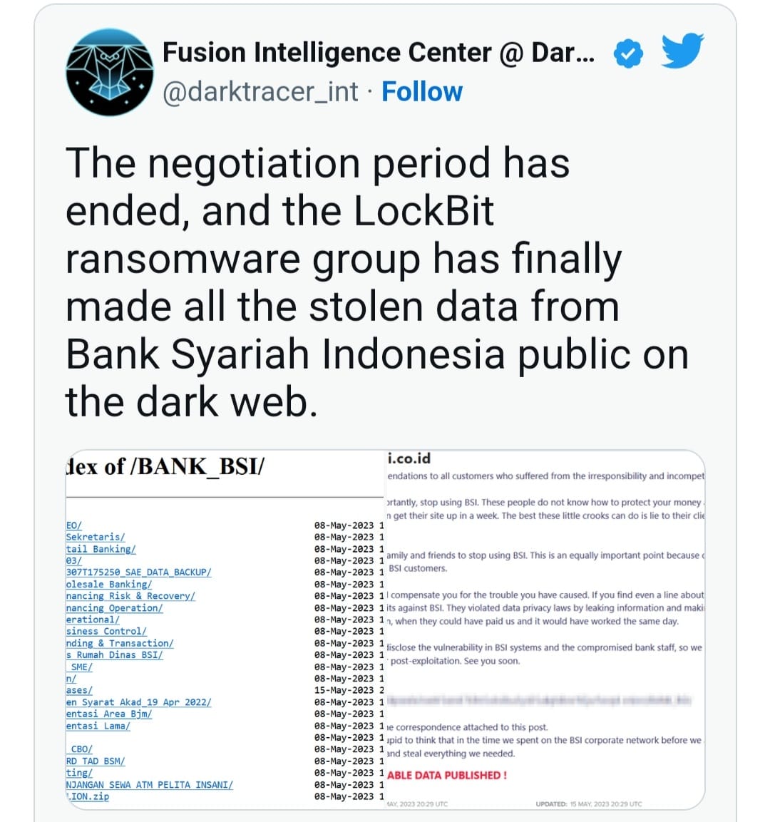 “Masa negosiasi telah berakhir, dan grup ransomware LockBit akhirnya mempublikasikan semua data yang dicuri dari Bank Syariah Indonesia di dark web,” cuit akun Twitter @darktracer_int dengan unggahan tangkapan layar mengenai data-data BSI dan imbauan LockBit kepada nasabah pada Selasa, 16 Mei 2023.