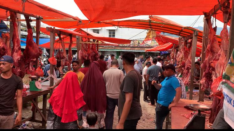 ACEH BESAR — Hari pertama meugang untuk menyambut bulan suci Ramadhan 1444 Hijriah, pasar-pasar tradisional yang ada di Kabupaten Aceh Besar ramai oleh pedagang daging musiman.