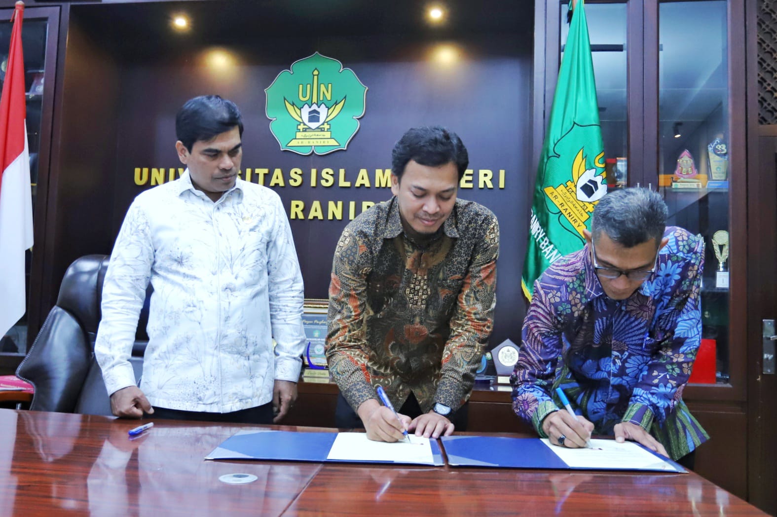 Naskah kerja sama diteken oleh Dekan FEBI UIN Ar-Raniry Dr Hafas Furqani MEc dengan Dekan FBIS UNDIRA Caturida Meiwanto Doktoralina PhD, disaksikan Rektor UIN Ar-Raniry Prof Dr Mujiburrahman MAg, di ruang Kerja Rektor, Darussalam Banda Aceh, Kamis (14/9/2023).