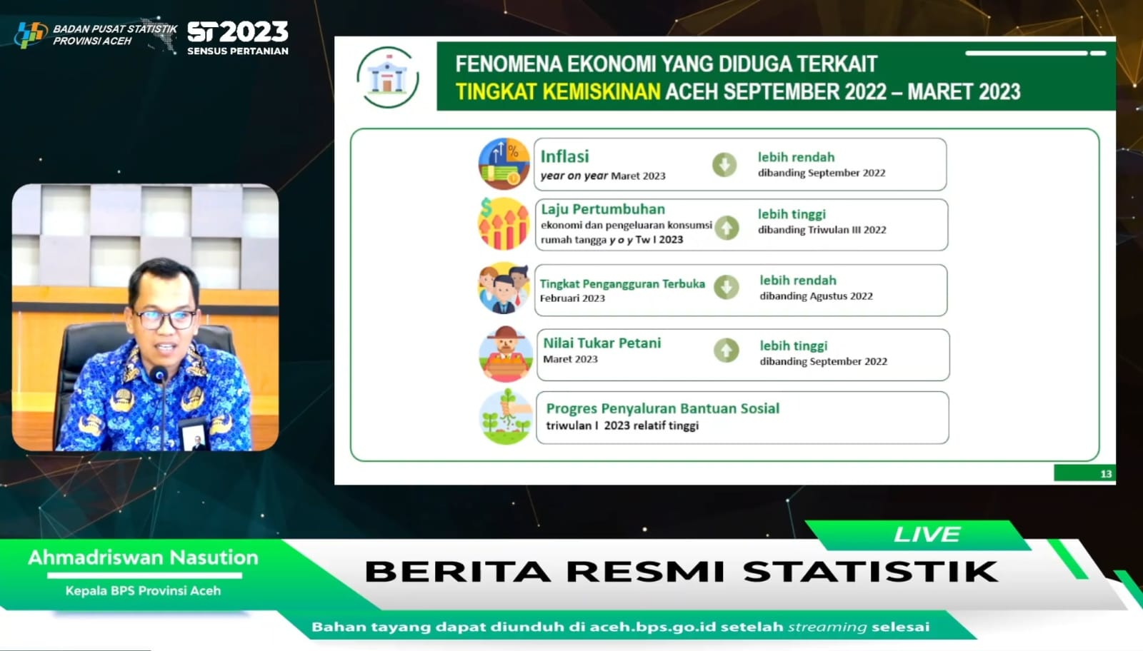 Lebih lanjut Kepala BPS Aceh Ahmadriswan Nasution menjelaskan Indeks Kedalaman Kemiskinan (P1) mengalami penurunan dari 2,897 pada September 2022 menjadi 2,763 pada Maret 2023.