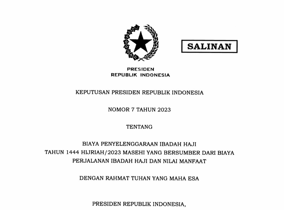 JAKARTA — Keputusan Presiden (Keppres) tentang Biaya Penyelenggaraan Ibadah Haji Tahun 1444 Hijriah/2023 Masehi yang Bersumber dari Biaya Perjalanan Ibadah Haji dan Nilai Manfaat sudah terbit.