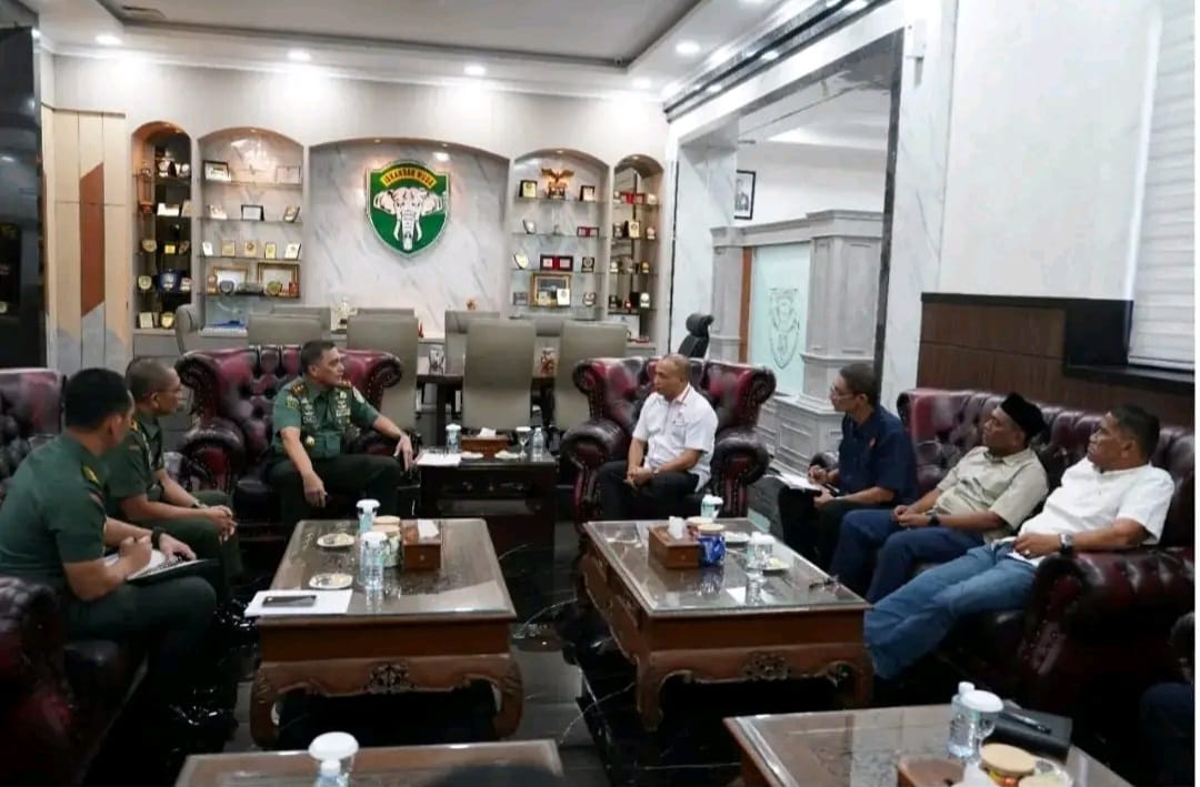 Pangdam IM Mayjen TNI Niko Fahrizal menerima audensi Ketua KONI Aceh Kamaruddin Abubakar atau Abu Razak beserta rombongan di ruang kerja Pangdam IM, Selasa (4/5/2024). Foto: Istimewa