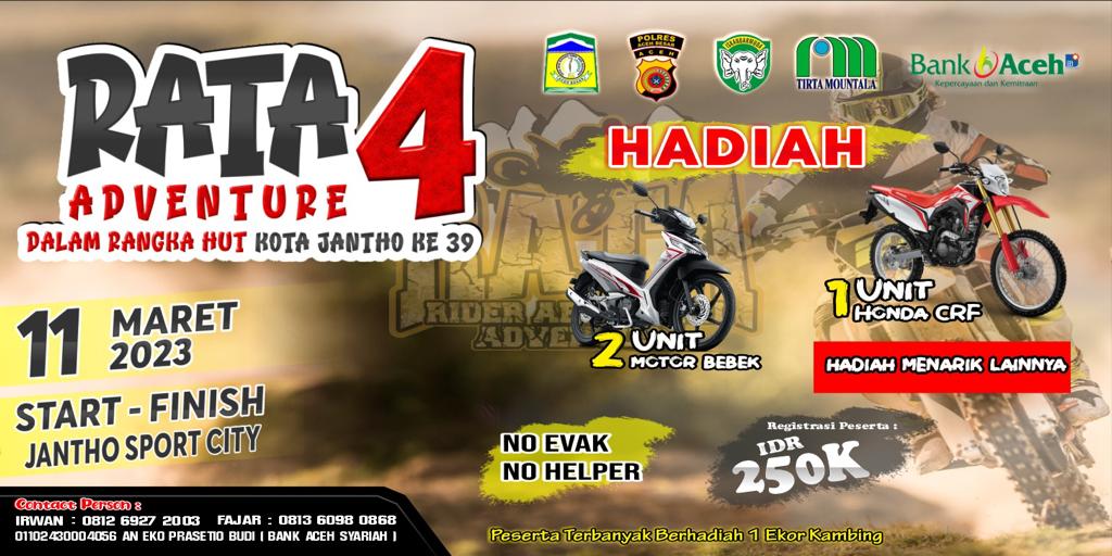 Ketua Panitia Penyelenggara event RATA-4, Ridwan Jamil atau akrab disapa RJ mengatakan, event trail adventure merupakan salah satu rangkaian kegiatan dalam memperingati HUT ke-39 Kota Jantho, hingga saat ini ratusan peserta rider dari berbagai daerah telah mendaftar untuk mengikuti gelaran tersebut.