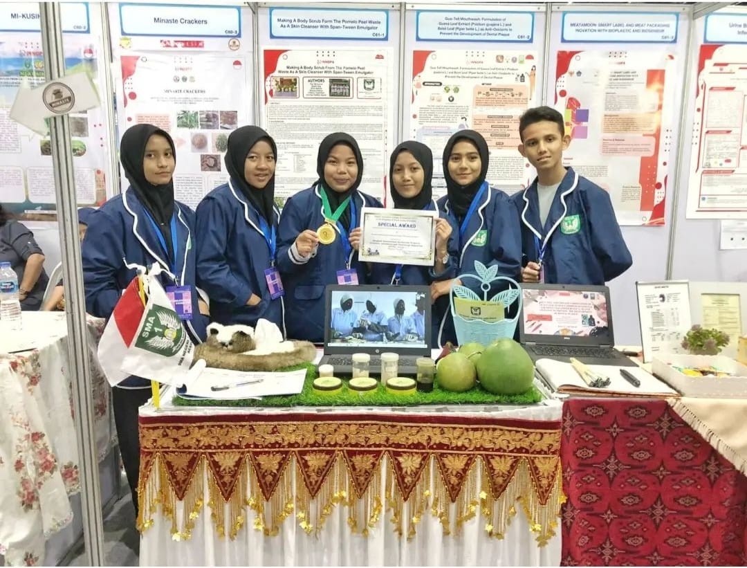 ACEH BESAR– Boh Giri Body Scrub, nama sebuah lulur produk inovatif siswa SMA Negeri 1 Ingin Jaya Aceh Besar berhasil meraih Special Award pada event internasional di Bangkok, Thailand, Senin (6/1/2023)