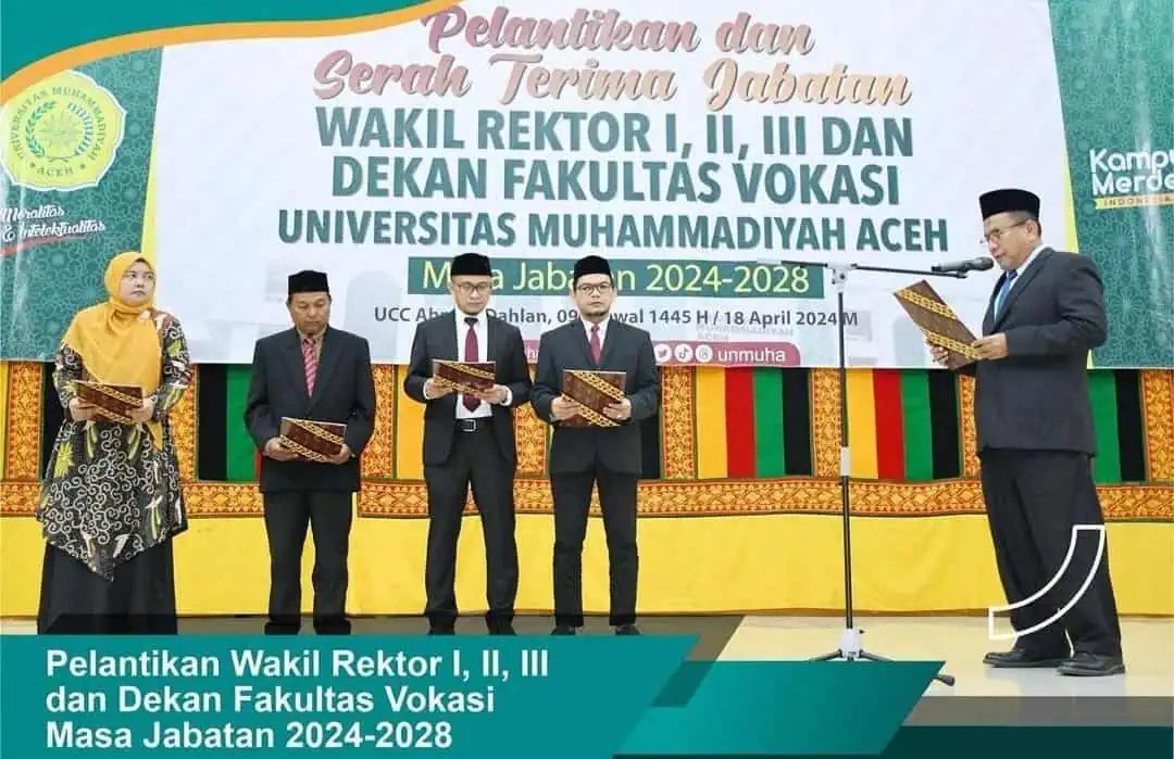 BANDA ACEH — Rektor Universitas Muhammadiyah Aceh (Unmuha) Dr Aslam Nur MA melantik Prof Asnawi Abdullah PhD sebagai Wakil Rektor 1, HM Yamin SE MSi sebagai Wakil Rektor 2 serta Dr Mirza Murni SE MM sebagai Wakil Rektor 3 untuk masa jabatan 2024-2028, bertempat di UCC Ahmad Dahlan Unmuha pada Kamis, 18 April 2024.