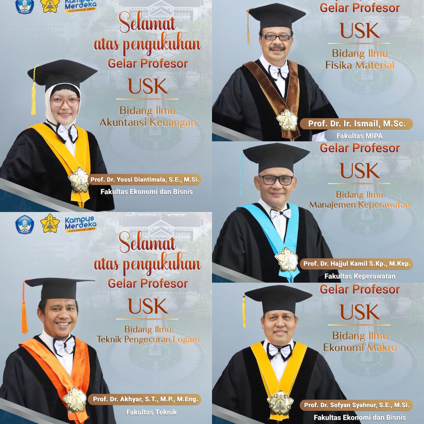 Mereka yang dikukuhkan adalah Prof Dr Sofyan Syahnur SE MSi, Prof Dr Ir Ismail MSc, Prof Dr Akhyar ST MP MEng, Prof Dr Yossi Diantimala SE MSi dan Prof Dr Hajjul Kamil SKp MKep.
