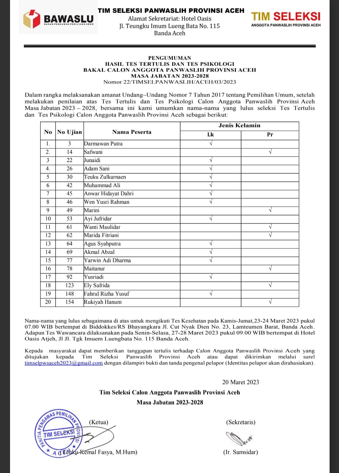 “Tim Seleksi Calon Anggota Panwaslih Aceh Periode 2023-2028 telah merilis pengumuman hasil seleksi peserta yang lulus tes CAT dan Tes Psikologi. Dalam pengumuman itu terpilih 20 nama yang lulus,” ujar Ketua Timsel, Teuku Kemal Fasya, Senin (20/3).