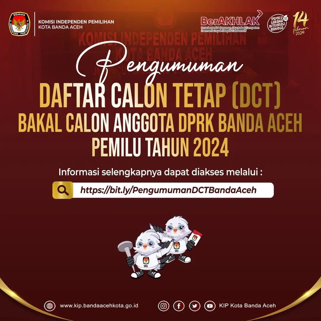 “Pengumuman Daftar Calon Tetap (DCT) dilihat pada website https://kip.bandaacehkota.go.id/ dan media sosial KIP Kota Banda Aceh, Papan Pengumuman dan Media Cetak,” ujar Rachmat. (IA)