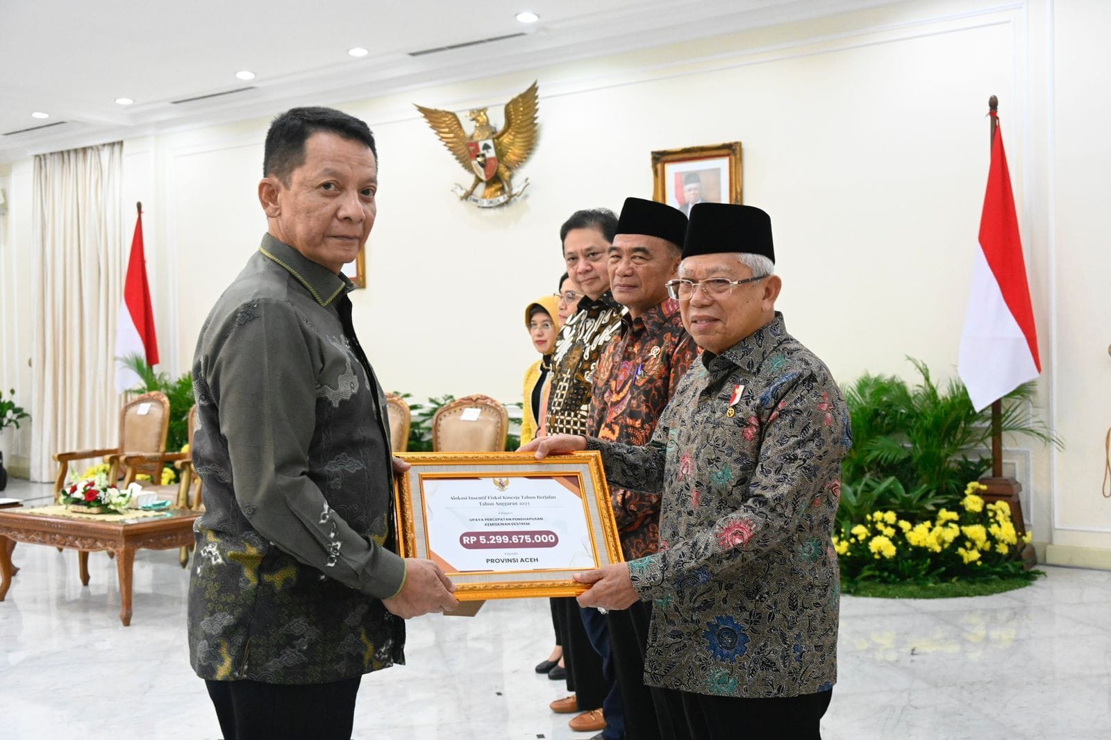 Penghargaan tersebut diberikan langsung oleh Wakil Presiden Ma’ruf Amin yang diterima Pj Gubernur Aceh Achmad Marzuki, dalam Rapat Koordinasi Nasional dan Penyerahan Insentif Fiskal Kategori Kinerja Penghapusan Kemiskinan Ekstrem Tahun Berjalan 2023, di Istana Wakil Presiden RI, Jakarta, Kamis (9/11).
