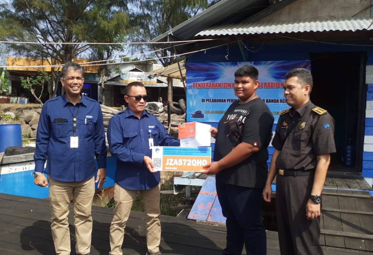 BANDA ACEH — Balai Monitor Spektrum Frekuensi Radio (Balmon SFR) Kelas II Banda Aceh menyerahkan Izin Komunikasi Radio Nelayan (IKRAN) untuk para nelayan di Pangkalan Kapal Sepakat, Gampong Jawa, Kecamatan Kutaraja, Banda Aceh.