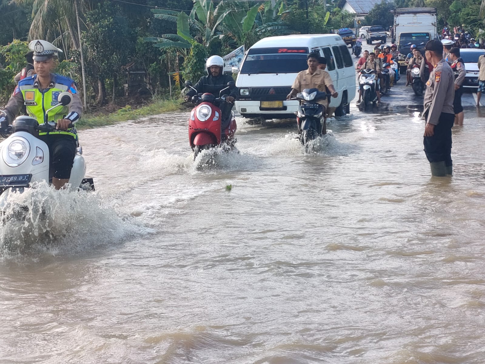 Tugas Polisi yang diturunkan itu untuk membantu warga, mengatur arus lalulintas agar tidak terjadi kemacetan serta membersihkan sejumlah pohon yang tumbang di lokasi banjir maupun di badan jalan.