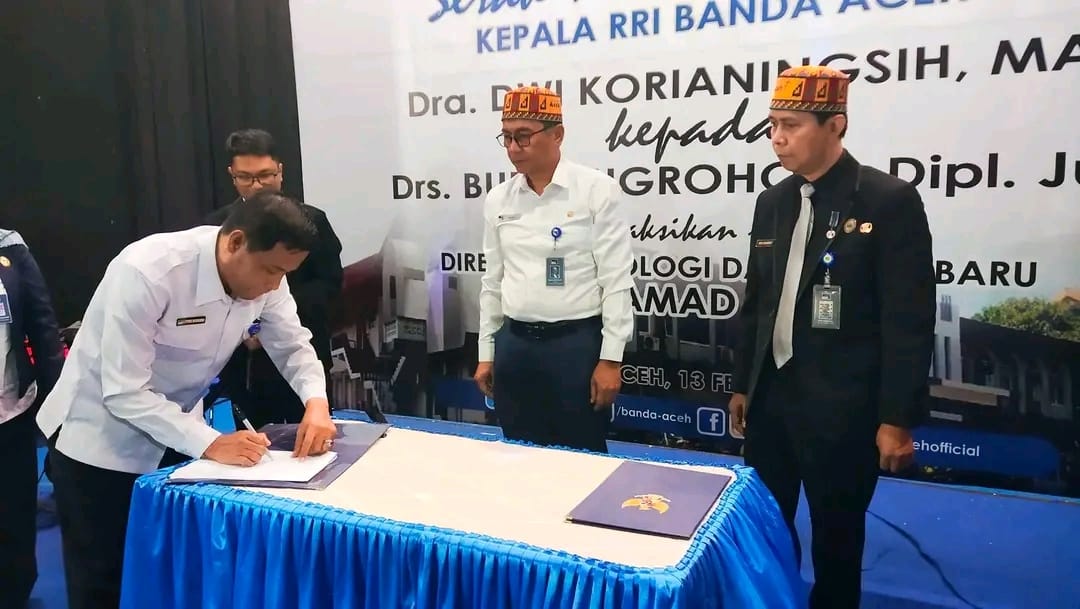 Prosesi serah terima jabatan dilakukan, di aula RRI Banda Aceh, Senin (13/2/2023). Sertijab ini turut disaksikan oleh Direktur Teknologi dan Media Baru, Muhammad Sujai.