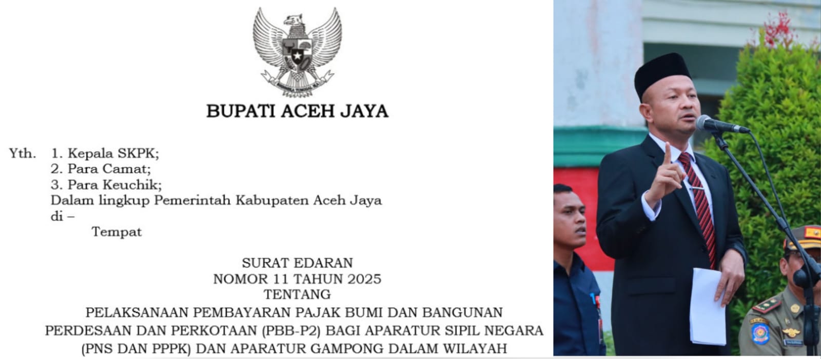 Langkah tegas ini tertuang dalam Surat Edaran Bupati Aceh Jaya Nomor 11 Tahun 2025 tentang pelaksanaan pembayaran PBB-P2 bagi ASN, PPPK, dan aparatur gampong.