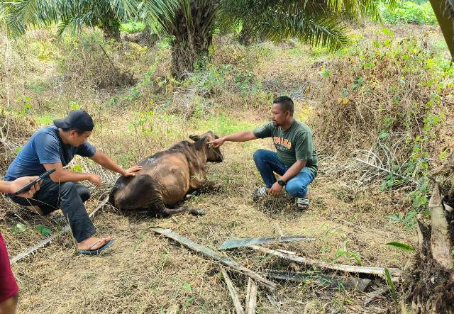 ACEH TIMUR — Seekor sapi diduga diserang Harimau di area Afdiling 1 Kebun PTPN Julok Rayeuk Selatan, Dusun Buket Panjang, Desa Panton Rayeuk T, Kecamatan Banda Alam Kabupaten Aceh Timur pada Ahad pagi (26/3/2023).
