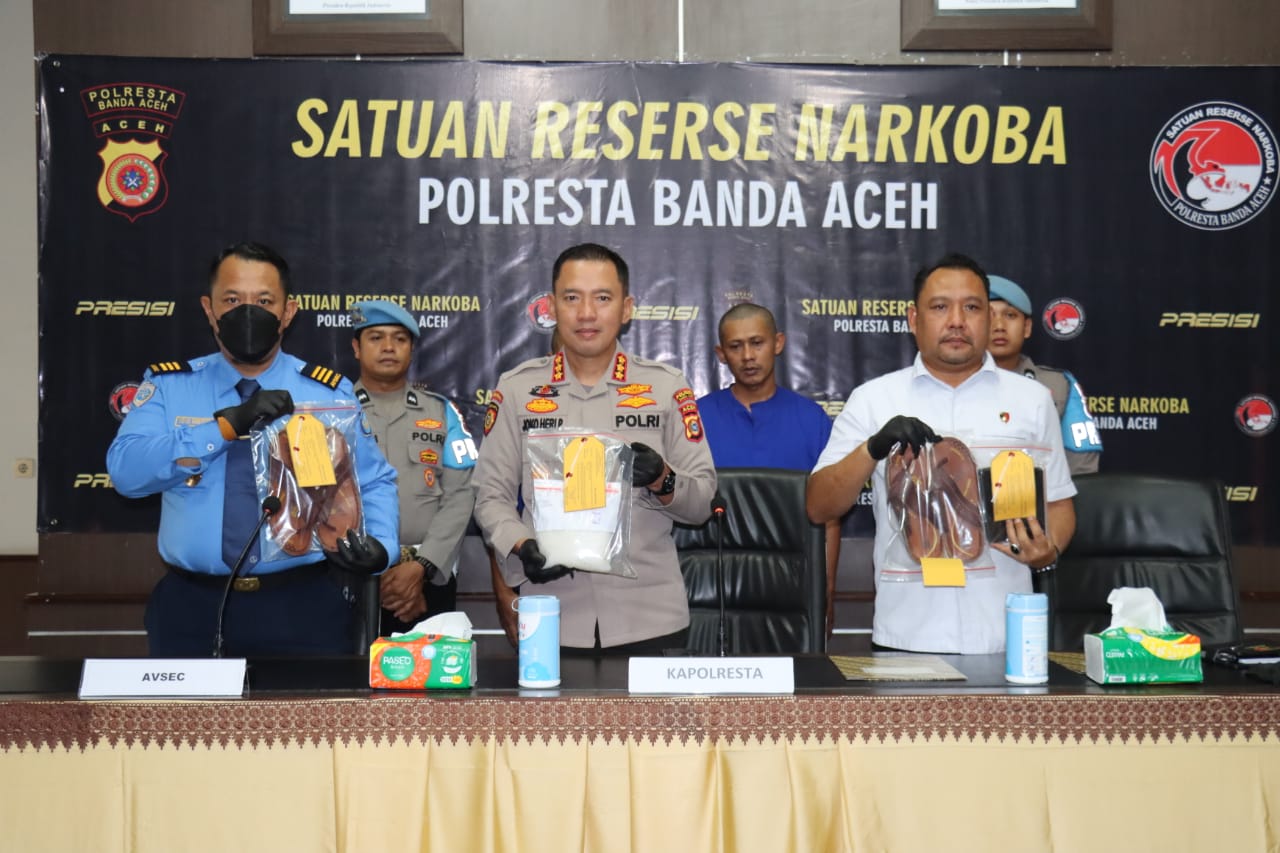 “Ada empat paket sabu yang ditemukan dalam sol sandal yang beratnya 900 gram,” ujar Kombes Joko didampingi Kasat Resnarkoba AKP Rajabul Asra dan Vovo Kristanto PGS Airport Security Departement Head Bandara SIM saat konferensi pers di Polresta Banda Aceh, Rabu (30/4/2025).