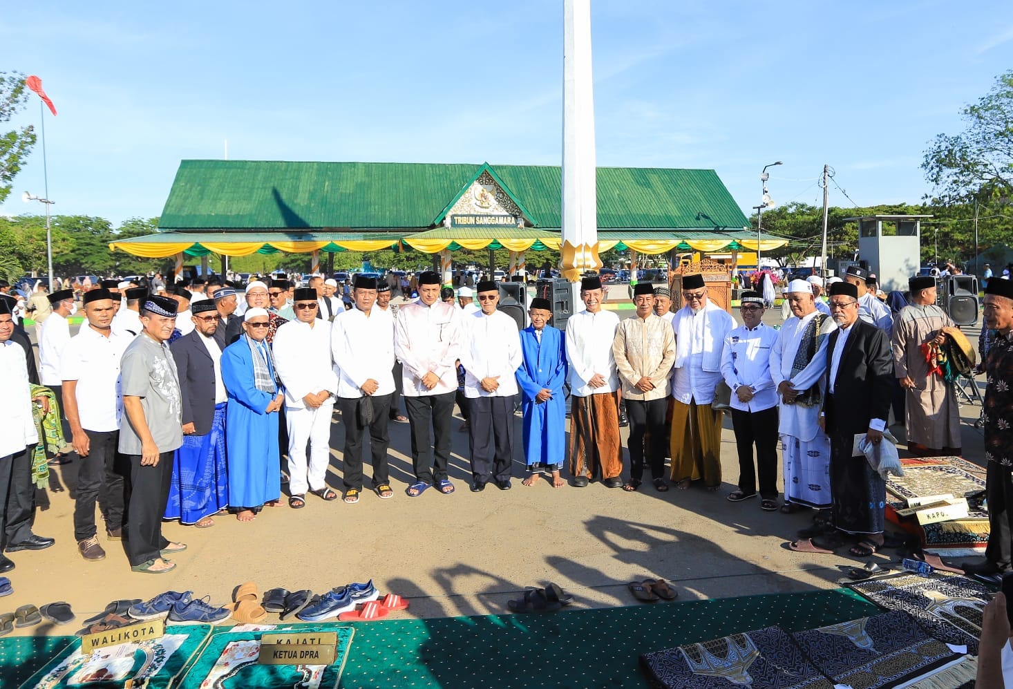Pj Gubernur Aceh Achmad Marzuki didampingi Sekretaris Daerah Aceh Bustami Hamzah dan serta seluruh unsur Forkopimda Aceh, terlihat berada di shaf depan. Larut dalam takbir membesarkan Asma Allah.