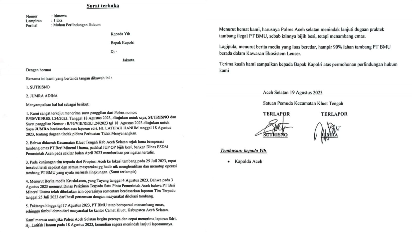 Dalam surat terbuka itu, keduanya membeberkan bahwa mereka sangat terkejut menerima surat panggilan dari Polres Aceh Selatan Nomor B/50/VIII/RES.1.24/2023 tanggal 18 Agustus 2023.
