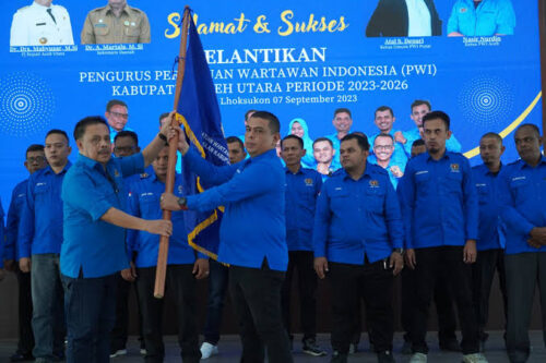 ACEH UTARA — Ketua Persatuan Wartawan Indonesia (PWI) Aceh Nasir Nurdin melantik pengurus PWI Aceh Utara periode 2023-2026, Kamis (7/9/2023).