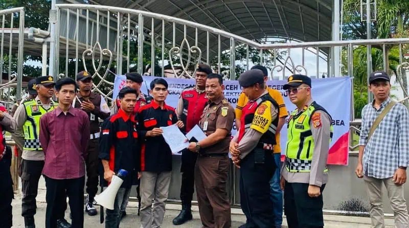INFOACEH.NET, BANDA ACEH — Dewan Pengurus Daerah Aliansi Mahasiswa dan Pemuda Anti Korupsi (DPD ALAMP AKSI) Banda Aceh berunjuk rasa di depan kantor Kejaksaan Tinggi (Kejati) Aceh, Kamis, 17 Oktober 2024.