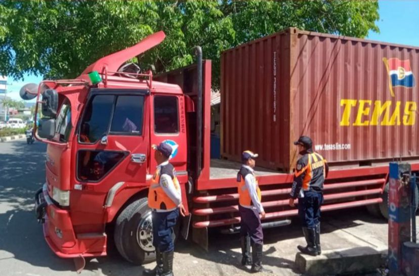 Petugas Dishub menertibkan truk bertonase besar yang mengangkut barang masuk ke dalam kota Banda Aceh