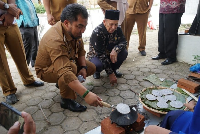 Muhammad Iswanto bersama Sekda Sulaimi sebelum menikmati apam, juga mencoba sensasi toet apam di halaman Kantor Dekranasda, turut disaksikan Asisten, Para Kepala OPD, Camat dan pengunjung yang ikut meramaikan kegiatan yang diprakarsai MAA Aceh Besar tersebut.