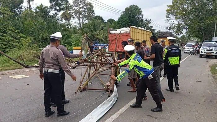 “Kondisi gapura sudah miring dan menghambat laju kendaraan besar sehingga personel Satlantas turun ke lokasi lalu merubuhkan gapura, selama proses evakuasi arus lalu lintas sempat dialihkan ke jalan alternativ melewati perkampungan,” ujar Iptu Bambang.