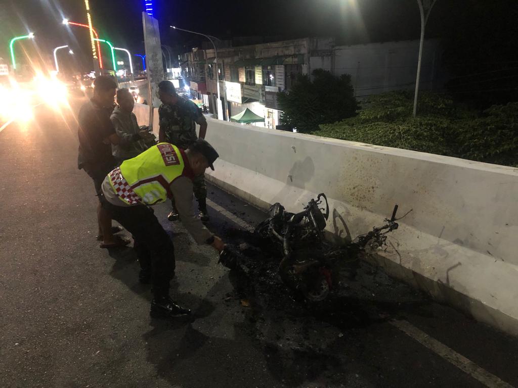 BANDA ACEH — Satu unit sepeda motor jenis Matic Merk Yamaha Mio Soul tahun 2009 terbakar di jalan layang (Fly Over) Simpang Surabaya Banda Aceh, Sabtu malam (16/9/2023).
