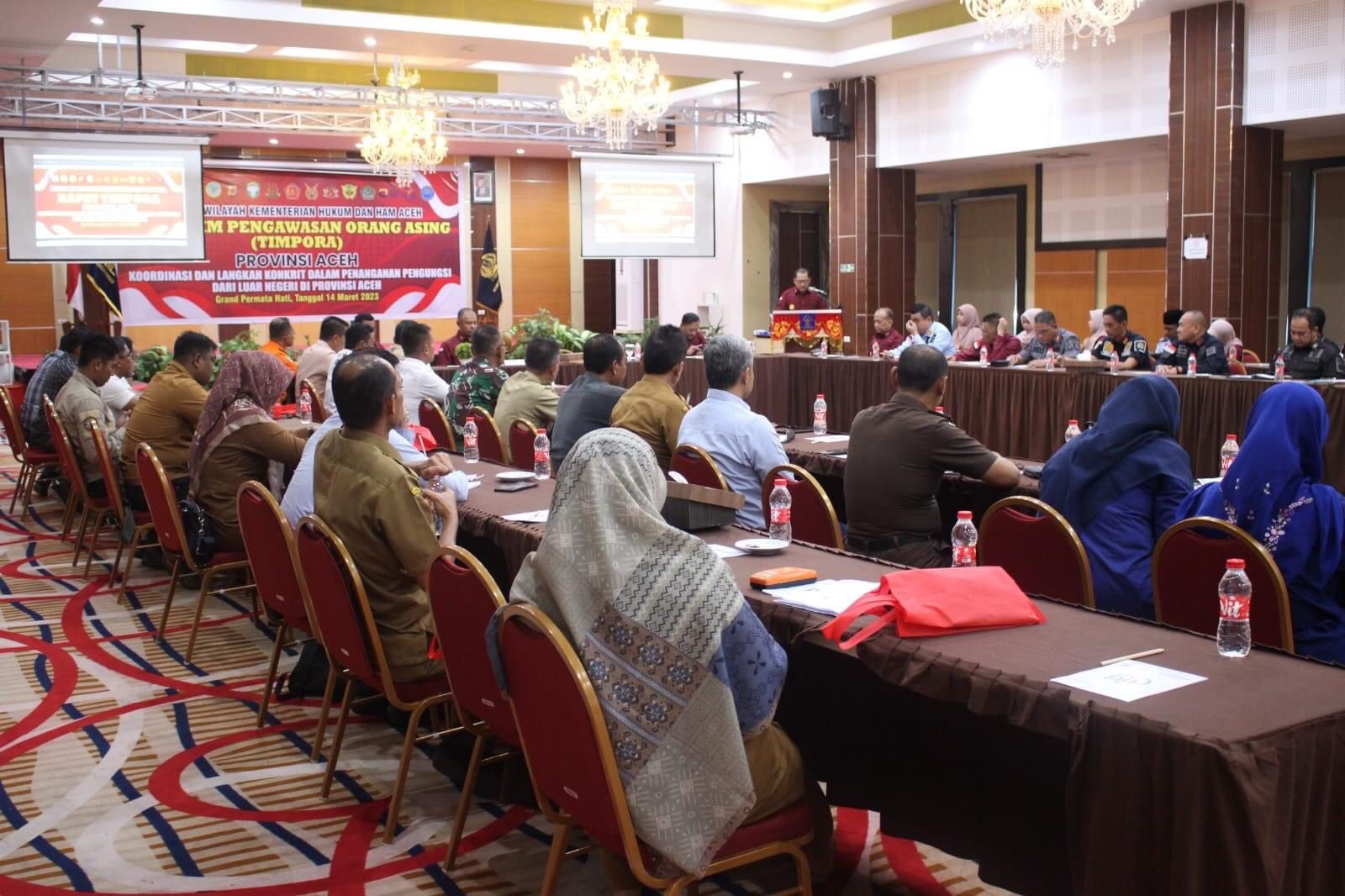 BANDA ACEH — Kantor Wilayah Kementerian Hukum dan HAM (Kemenkumham) Aceh menggelar Rapat Koordinasi Tim Pengawasan Orang Asing (Pora) Provinsi Aceh di Hotel Grand Permata Hati, Banda Aceh, Selasa (14/3/2023).