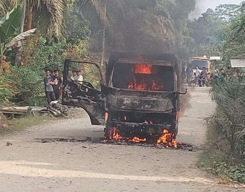 ACEH TAMIANG —- Warga Kampung Tenggulun, Kecamatan Tenggulun, Kabupaten Aceh Tamiang mengamuk dan membakar satu unit dump truk Nopol BK 8471 CI, pada Sabtu, 15 April 2023.