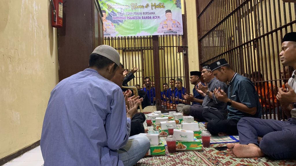 BANDA ACEH — Dalam meningkatkan penguatan mental dan iman di bulan puasa, Satuan Tahanan dan Barang Bukti (Tahti) Polresta Banda Aceh membagikan takjil dan berbuka puasa bersama (Bukber) sebagai bentuk kepedulian terhadap tahanan di dalam rutan setempat.