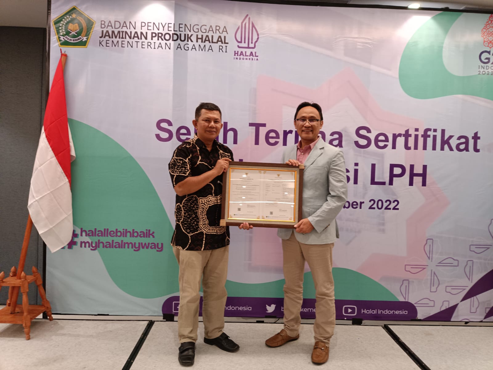 Kepala BPJPH Dr Muhammad Aqil Irham menyerahkan sertifikat akreditasi kepada Ketua LPH USK Fahrizal di Hotel Mercure Jakarta, 26 Oktober 2022